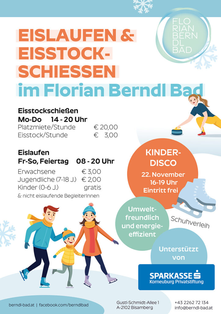 Am Samstag, 22. November 2025, öffnet im Florian Berndl Bad der Kunsteislaufplatz. Zur Feier der Eröffnung ist der Eintritt am Samstag 22. November kostenlos. Von 16:00 bis 19:00 Uhr findet außerdem eine Kinderdisco statt, die für stimmungsvolle Unterhaltung sorgt.